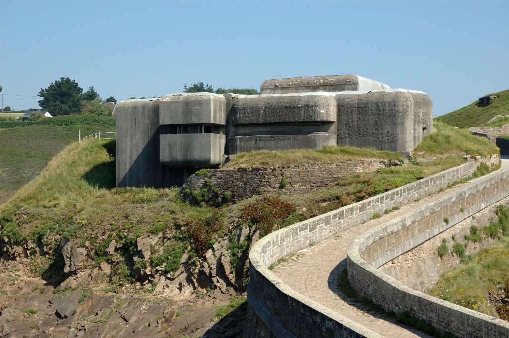 Vue générale sud du bunker - poste de commandement de type M 162a modifié : il repose sur la batterie d'artillerie de côte. A droite, le pont menant au phare du MinouImmatriculation