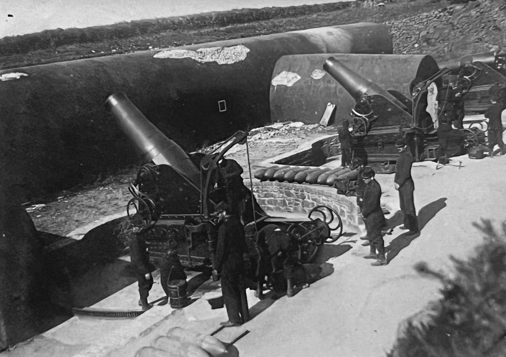 Vue d'un exercice de tir au mortier modèle 1883-T-1893 sur affûts Marine modèle 1883 à pivot antérieur modifié, non daté (collection particulière)Immatriculation