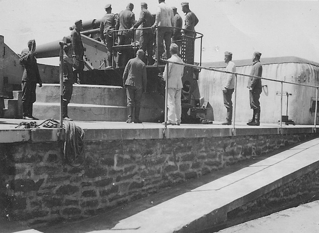 Vue de la batterie de 240 mm à tir rapide durant un exercice lors de la Seconde Guerre mondiale (collection particulière). Il s'agit d'artilleurs allemandsImmatriculation