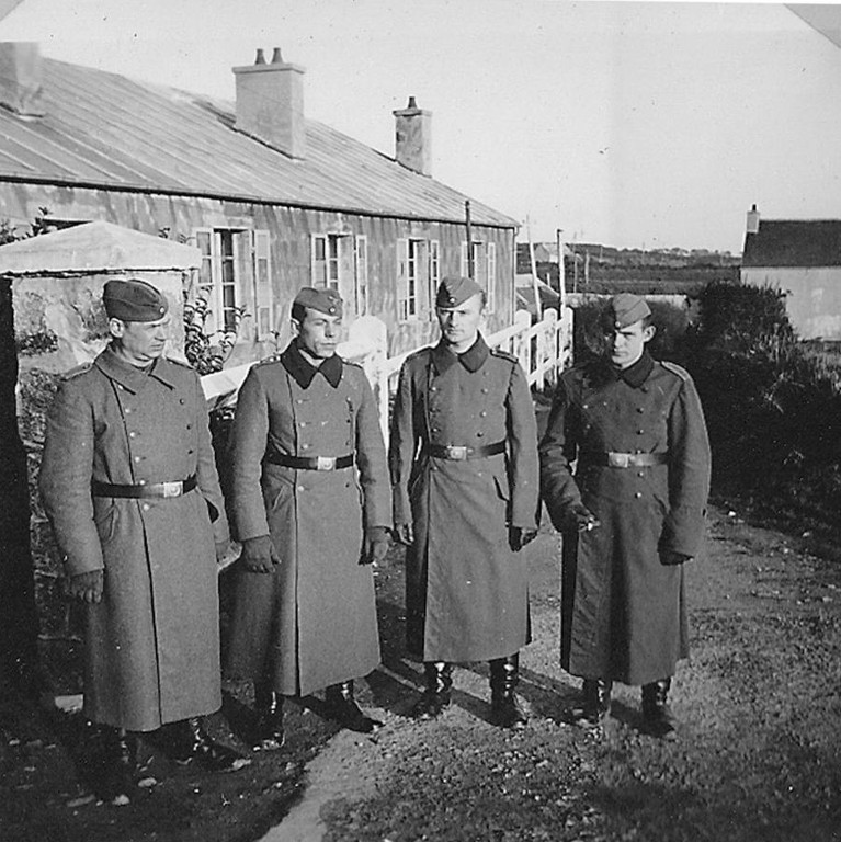 Vue d'un groupe de quatre soldats allemands dans le camp de Toulbroc'h durant la Seconde Guerre mondiale (collection particulière). A l'arrière-plan, se trouve un casernement peint en camouflageImmatriculation