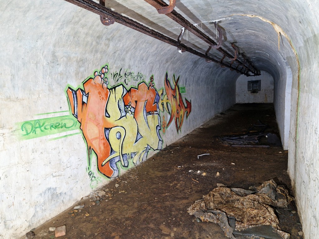 Vue intérieure du magasin à munitions : extrémité ouest, fixations et rail pour la manutention des obus via un palan. Ce grafitti est daté de 2008Immatriculation