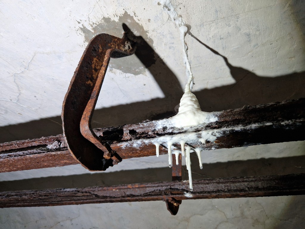 Vue intérieure du magasin à munitions : détail des fixations et rail pour la manutention des obus via un palanImmatriculation