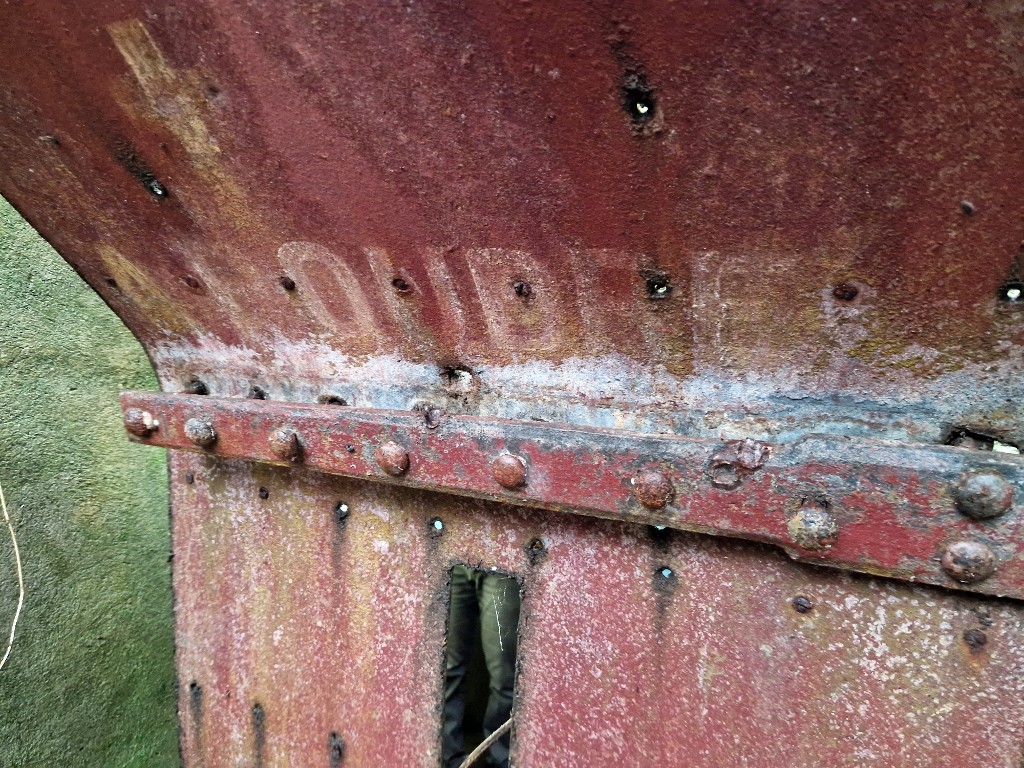 Vue de la porte en bois doublée d'une plaque métallique. Le battant de porte conserve sa peinture rouge d'origine et l'inscription [MAGASIN] A POUDREImmatriculation
