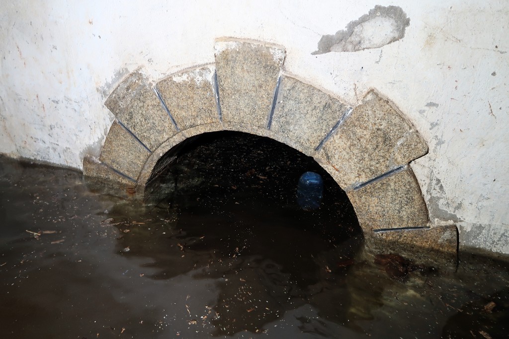 Vue de l'aqueduc dans le vestibule côté escalier. Le magasin est inondé : l'eau ne s'évacue pas totalement car l'aqueduc est partiellement bouché en avalImmatriculation