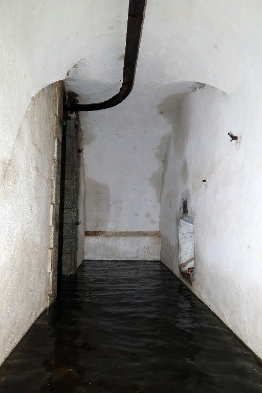 Vue du vestibule côté puits du monte-charge. Suspendu au plafond, le rail permettait la manutention des obus via le treuil. Le magasin est partiellement inondéImmatriculation