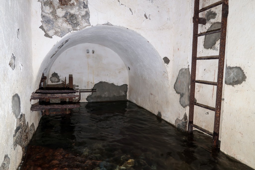 Vue de la chambre du treuil manuel à tambour du puits du monte-charge. Le puits est doublé par une échelleImmatriculation