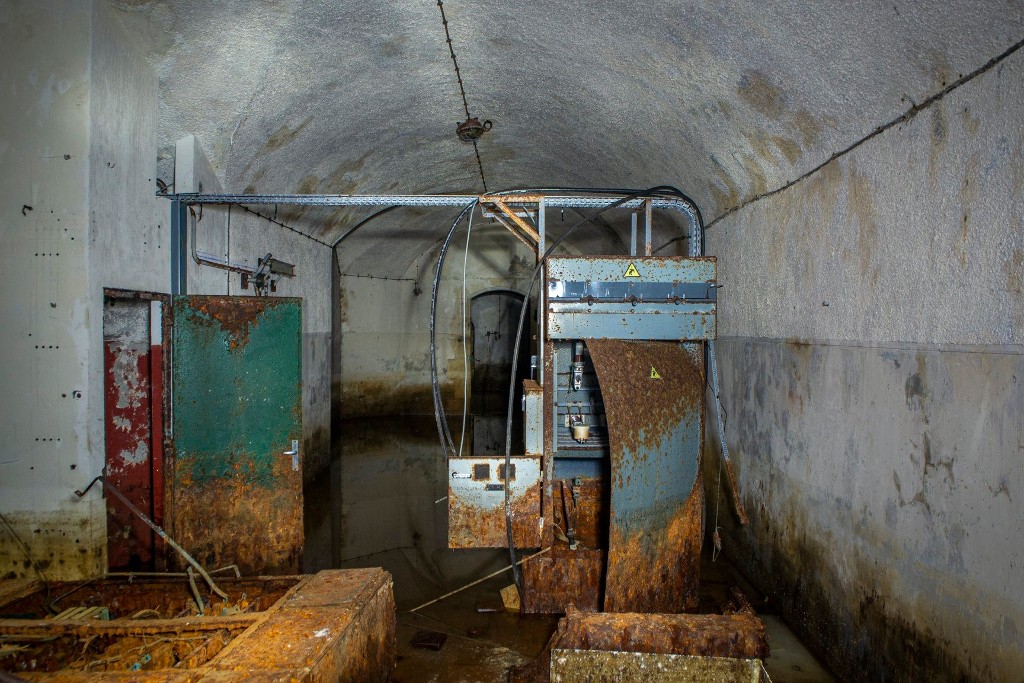 Vue intérieure : couloir de circulation aux deux chambres de tir transformées en abri usine. Au centre, transformateur électrique (image publiée sur les réseaux sociaux issue d'une visite non autorisée, elle n'est volontairement pas sourcée)Immatriculation