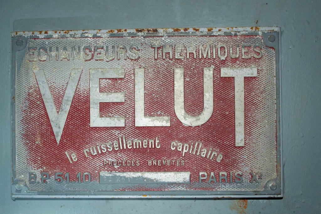 Vue intérieure : plaque constructeur VELUT, le ruissellement capillaire, entreprise spécialisée en échangeurs thermiques (image publiée sur les réseaux sociaux issue d'une visite non autorisée, elle n'est volontairement pas sourcée)Immatriculation