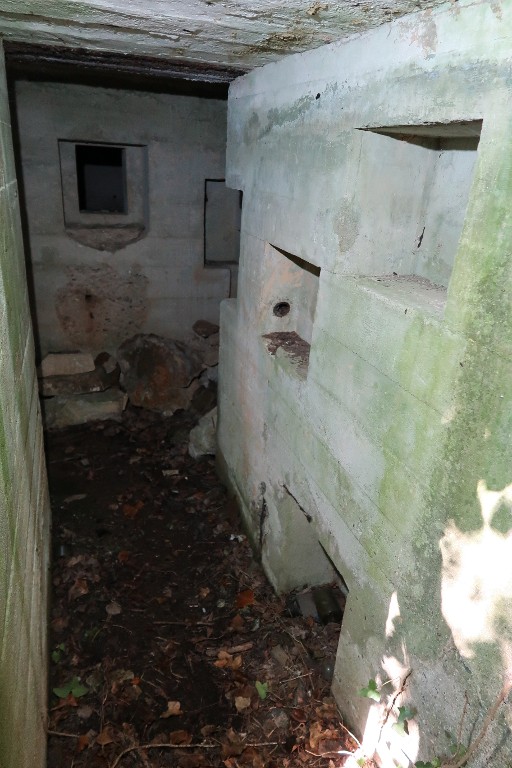 Vue de l'entrée est : couloir d'accès flanqué par un créneau de tir. Sur le mur de droite se trouvent trois niches muralesImmatriculation