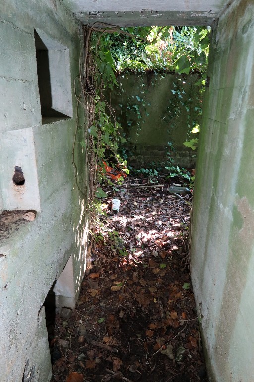 Vue de l'entrée est : couloir d'accès flanqué par un créneau de tir. Sur le mur se trouvent trois niches muralesImmatriculation