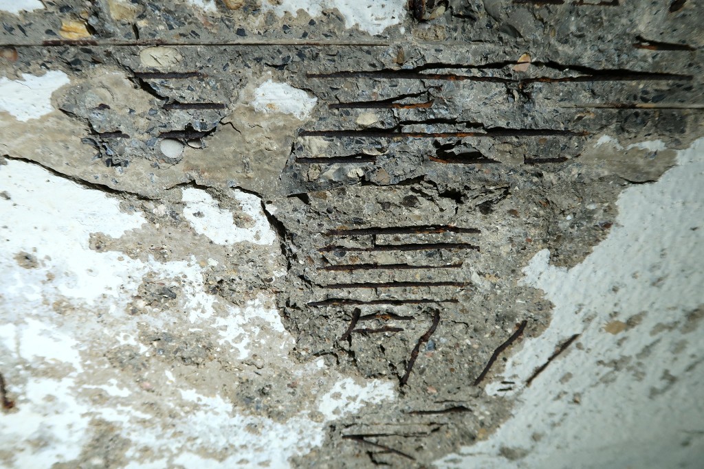 Vue du sas : détail du ferraillage du plafond. Il est blanchi à la chauxImmatriculation