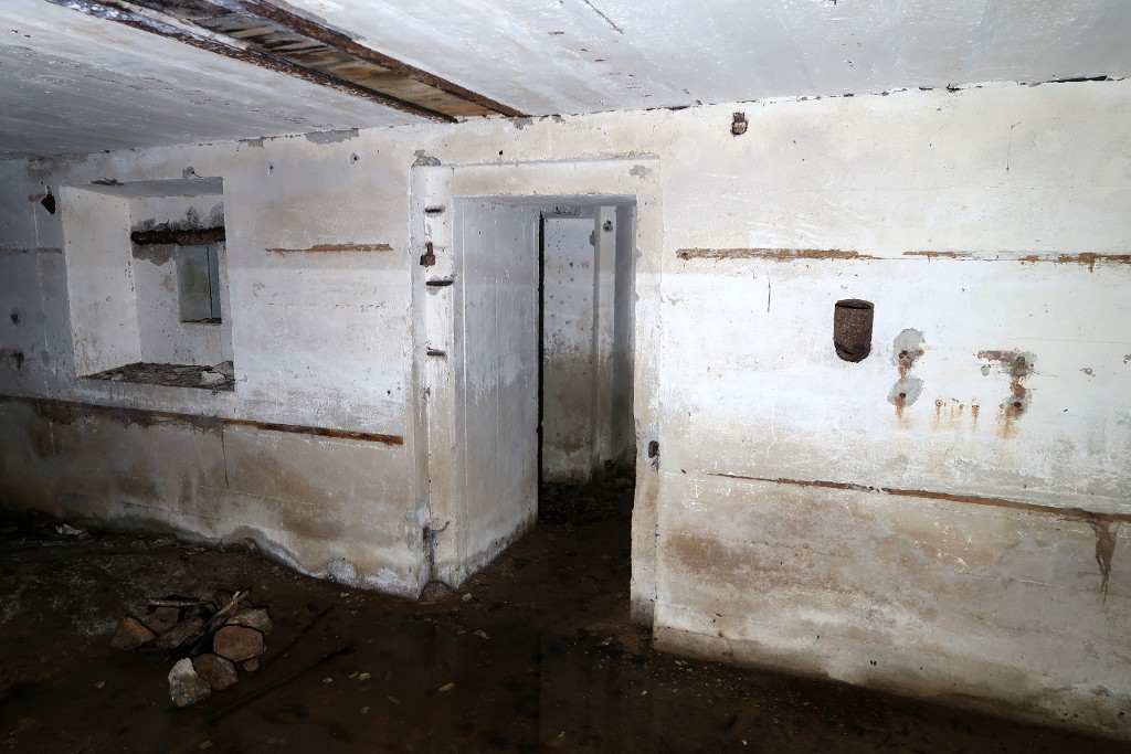 Vue intérieure : unique entrée des salles de garde est et ouest. La porte blindée ne semble pas avoir été posée (des gonds ont cependant été mis en place). De part et d'autre de la porte : créneau blindé [non posé] emplacement du ventilateurImmatriculation
