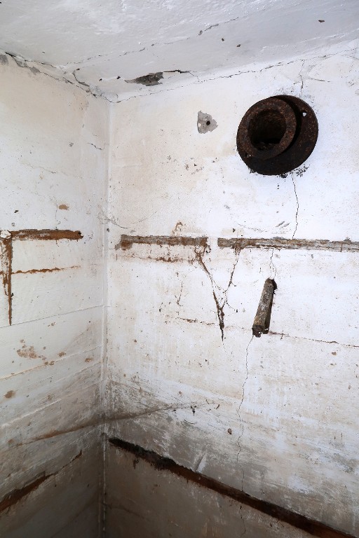 Vue intérieure : détail de l'angle sud-ouest de la de la salle de garde ouest avec l'emplacement de la conduite du poêleImmatriculation