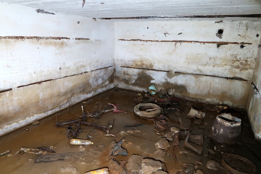 Vue intérieure : salle de garde est. Divers déchets baignent dans l'eau et la boue...Immatriculation
