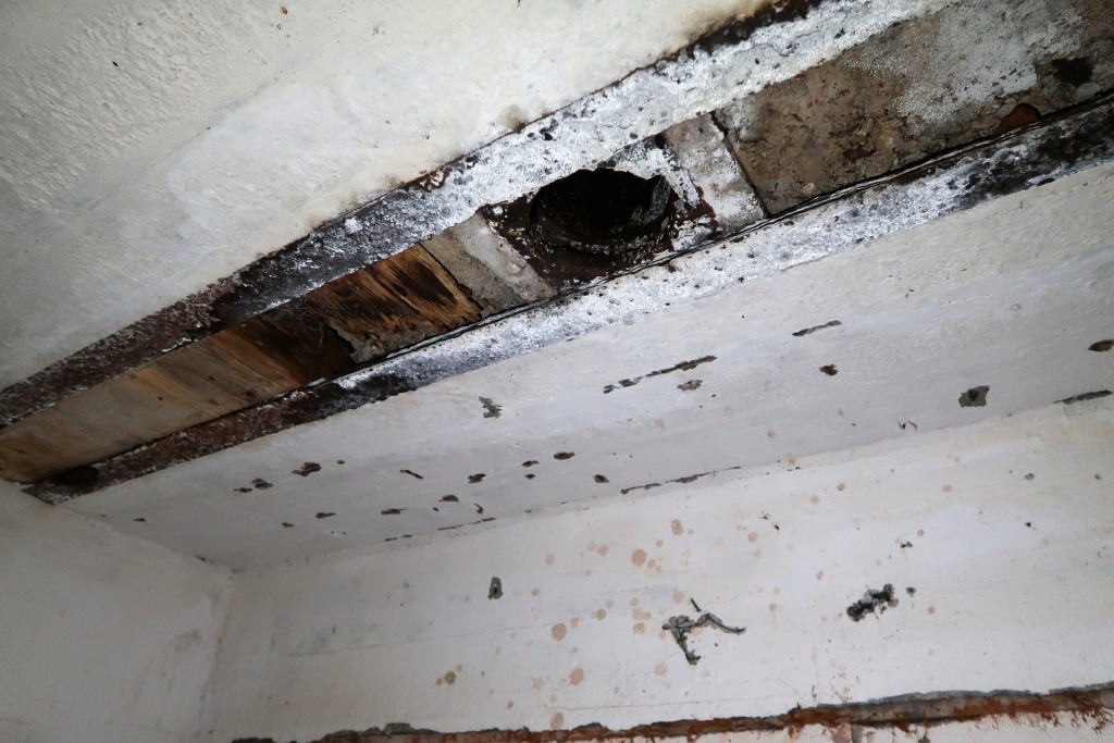 Vue intérieure : détail du plafond de la salle de garde est, puits pour un périscope ?Immatriculation