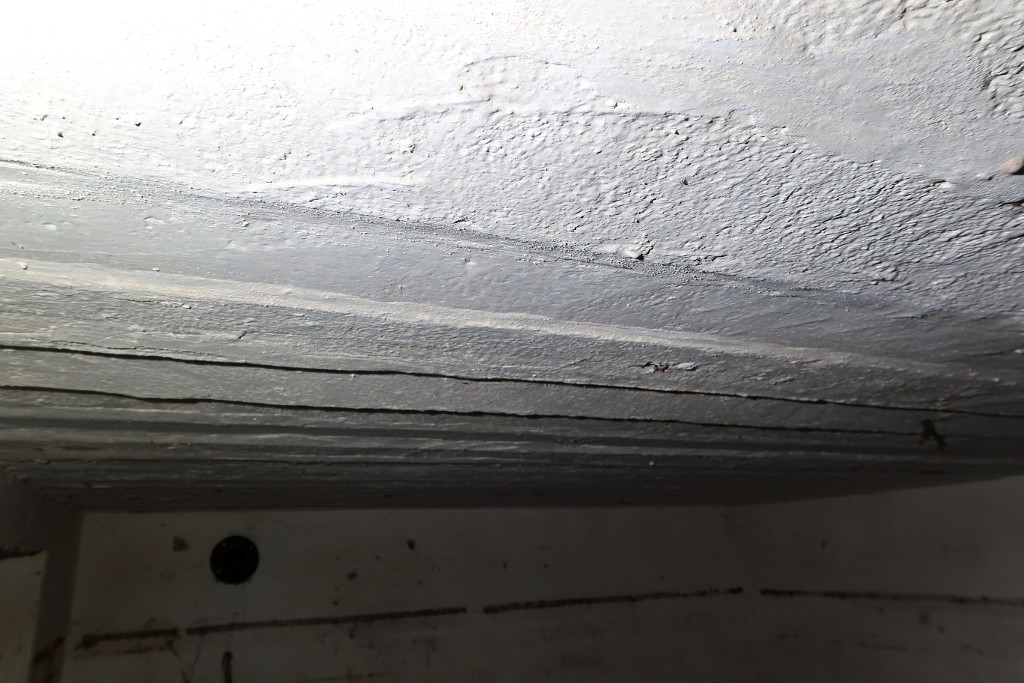 Vue intérieure : détail du plafond constitué de poutres en béton armé sur lesquelles a été coulée la dalle en béton arméImmatriculation