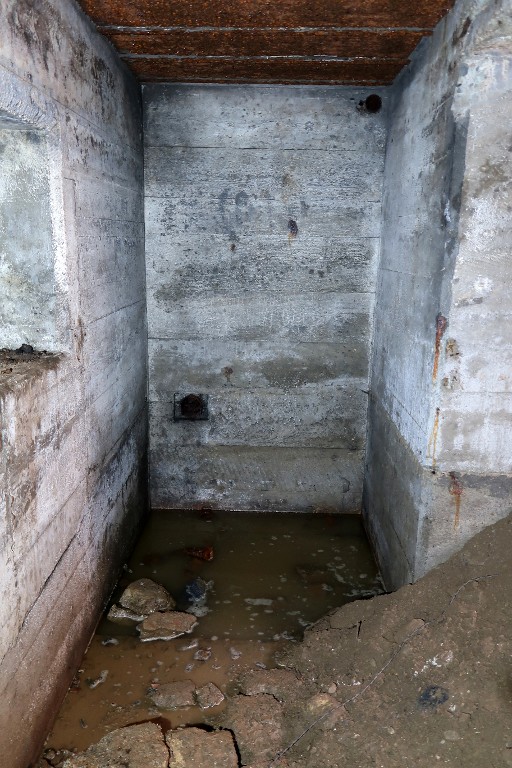 Vue du l'entrée nord : couloir d'accès flanqué par un créneau de tir, extrémité nord du couloirImmatriculation