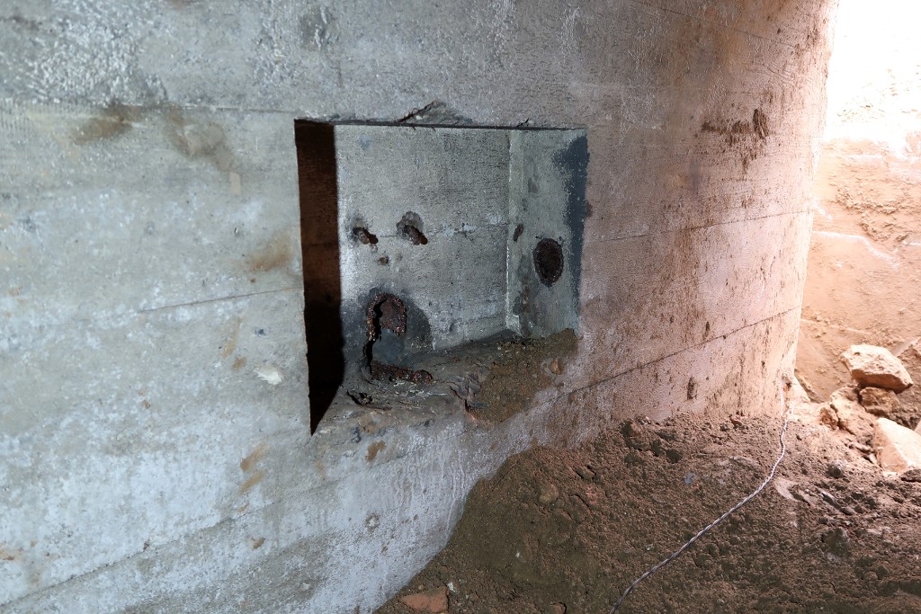 Vue du l'entrée nord : couloir d'accès flanqué par un créneau de tir, niche murale avec passage de câbleImmatriculation