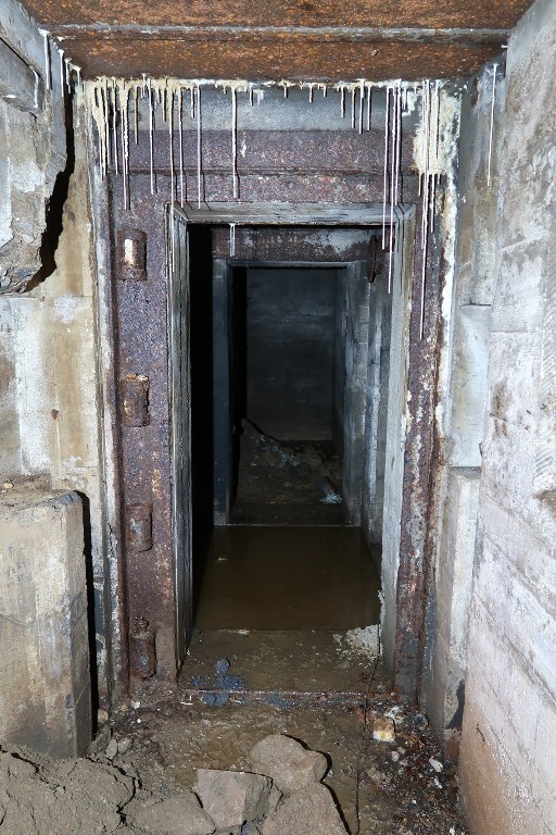 Vue de l'entrée du sas depuis le nord. L'huisserie témoigne du montage d'une porte blindée. De part et d'autre du couloir, un puits d'antenne radioImmatriculation