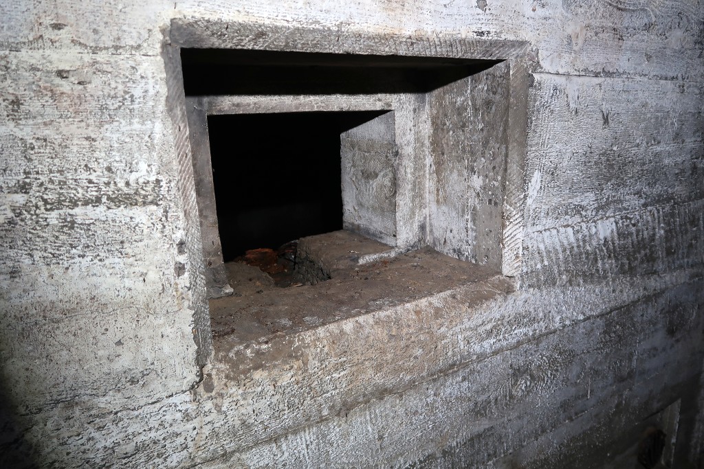Vue du l'entrée sud : couloir d'accès flanqué par un créneau de tir. Le créneau blindé n'a pas été poséImmatriculation