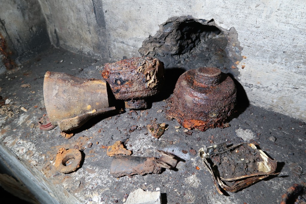 Vue intérieure : salle de garde sud avec créneau blindé [non posé], différents artéfacts rouillésImmatriculation