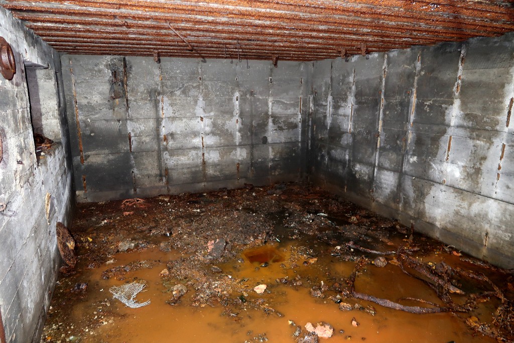 Vue intérieure : salle de garde sud. Au sol et baignant dans l'eau, divers artéfacts rouillés et débris de munitionsImmatriculation