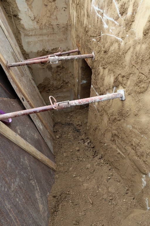 Vue de l'accès à l'entrée sud (creusé par une pelle mécanique hydraulique dans le cadre de l'opération de déminage). Deux entrées sont aménagées dans l'élévation estImmatriculation
