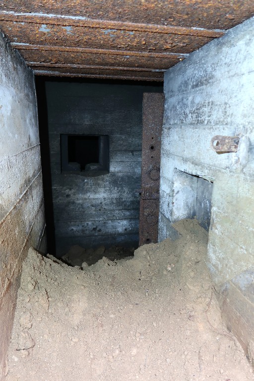 Vue du l'entrée sud : couloir d'accès flanqué par un créneau de tir. Le créneau blindé n'a pas été posé. A droite, niche murale avec passage de câble. Au fond, on devine la porte blindée à deux vantauxImmatriculation