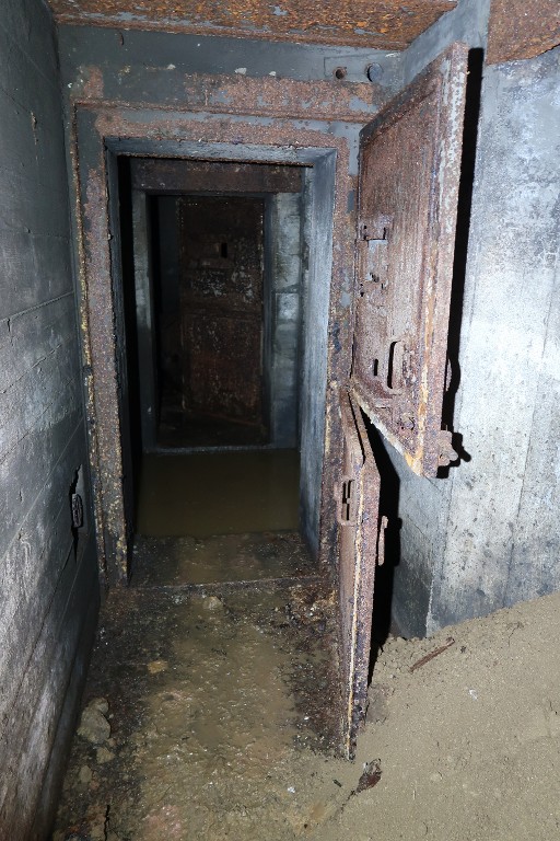 Vue de l'entrée du sas depuis le sud avec sa porte blindée à deux vantauxImmatriculation