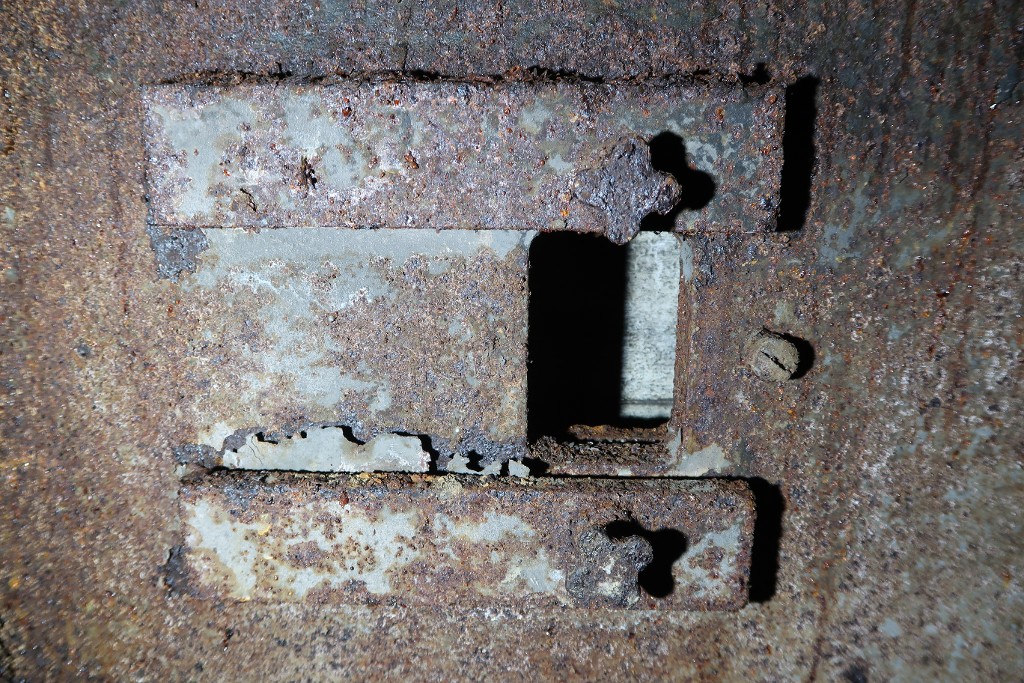 Vue de détail de la porte blindée à deux vantaux du sas (côté sud) : judas avec volet coulissant du vantail du hautImmatriculation