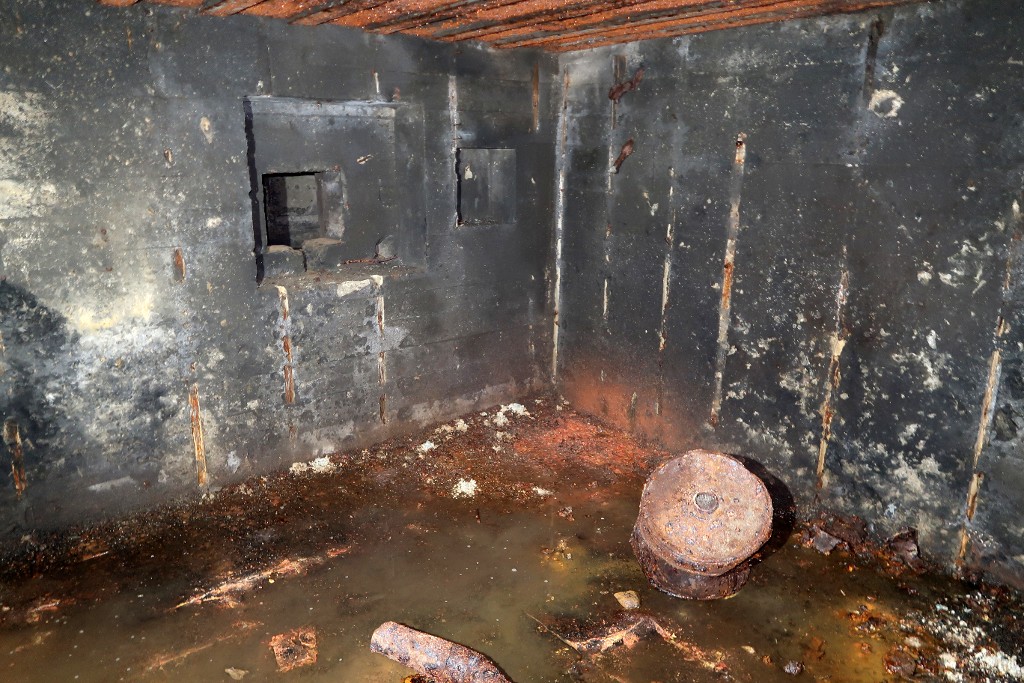 Vue de la salle de garde sud : créneau de tir et niche murale. Les murs sont constellés déclats et noircis par la fumée. Au sol, baignant dans l'eau : tuyau de la ventilation et filtre à charbon du ventilateurImmatriculation