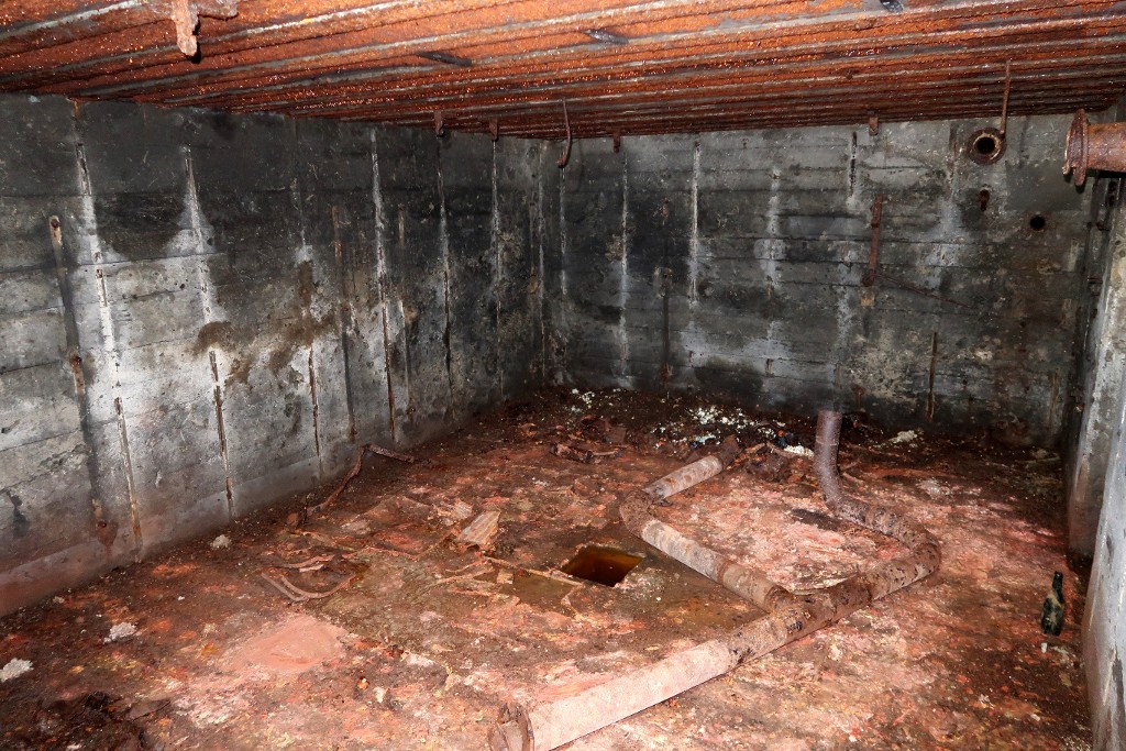 Vue de la salle de garde nord : les murs sont constellés déclats et noircis par la fumée. Le sol est constitué de carreaux en terre cuite. Le tuyau du système de ventilation gît au solImmatriculation