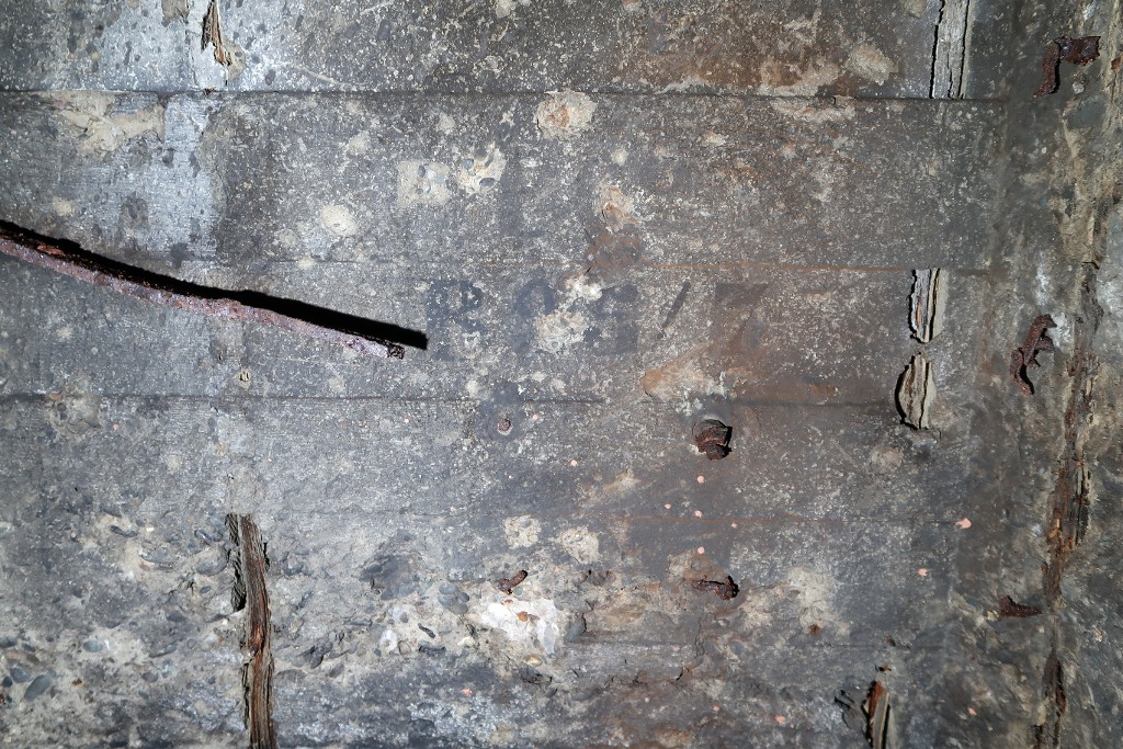 Vue de la salle de garde nord : détail de l'angle nord-est, emplacement du boîtier de connexion téléphonique avec la numérotation B 25 / 7 du bunker. Les murs sont constellés déclats et noircis par la fuméeImmatriculation