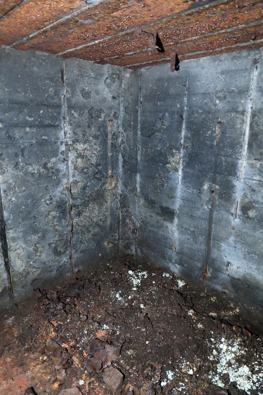 Vue de la salle de garde nord : angle nord-ouest. Les murs sont constellés déclats et noircis par la fumée. Au plafond, crochets de suspension des couchettes [disparues]Immatriculation