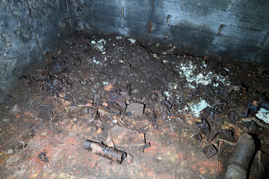Vue de la salle de garde nord : angle nord-ouest. Au sol, les éclats métalliques fortement corrodés sont issus du désobusage d'après-guerre. Les murs sont constellés déclats et noircis par la fuméeImmatriculation