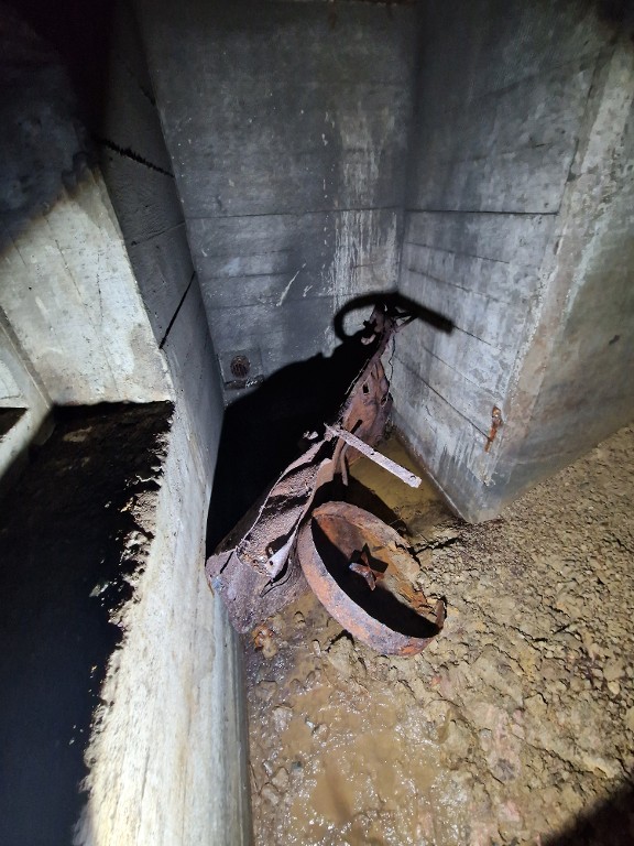 Vue de l'entrée nord : extrémité nord du couloir. Au sol, vestiges de la porte blindée légère des salles de garde et filtre à charbon du ventilateurImmatriculation