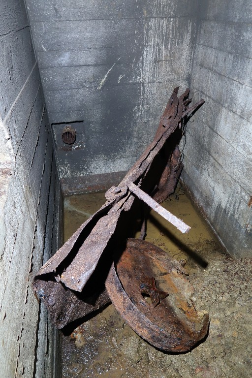 Vue de l'entrée nord : extrémité nord du couloir. Au sol, vestiges de la porte blindée légère des salles de garde et filtre à charbon du ventilateurImmatriculation