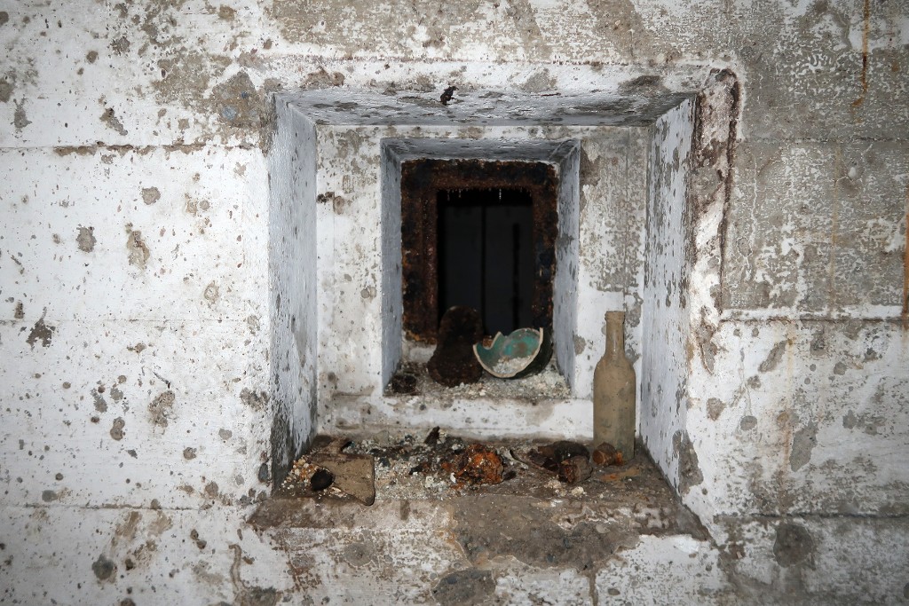 Vue de l'entrée sud remblayée : créneau de tir. Les murs en béton sont constellés d'éclats ; sur le créneau faisant tablette, différents artefacts dont une bouteilleImmatriculation