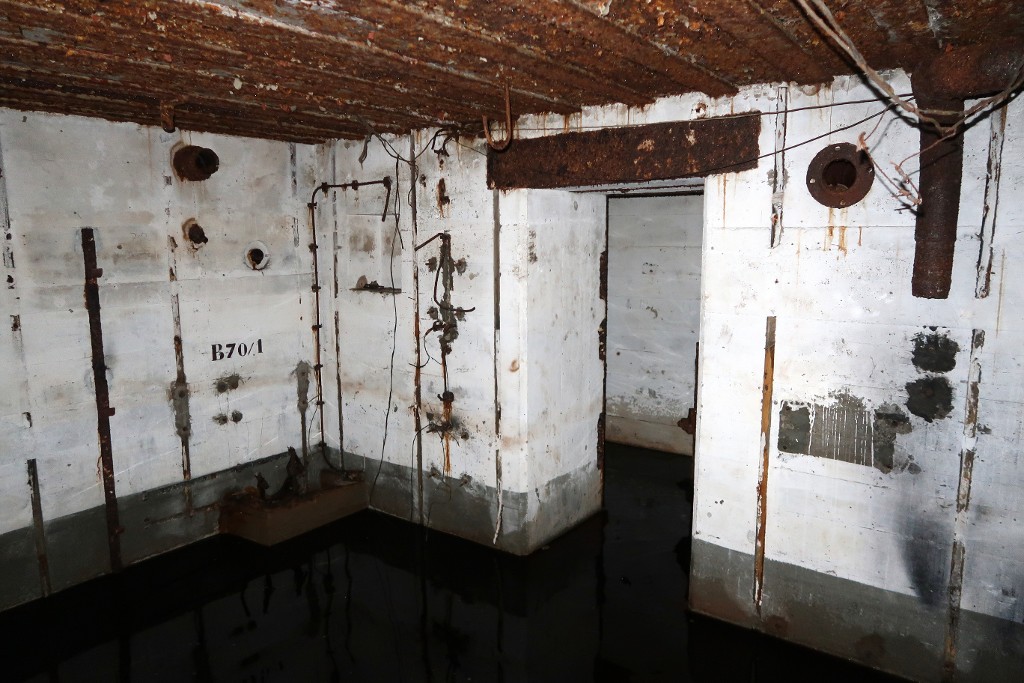 Vue intérieure : salle de garde nord. Sur le mur nord se trouve peint le numéro du bunker : B 70 / 1Immatriculation
