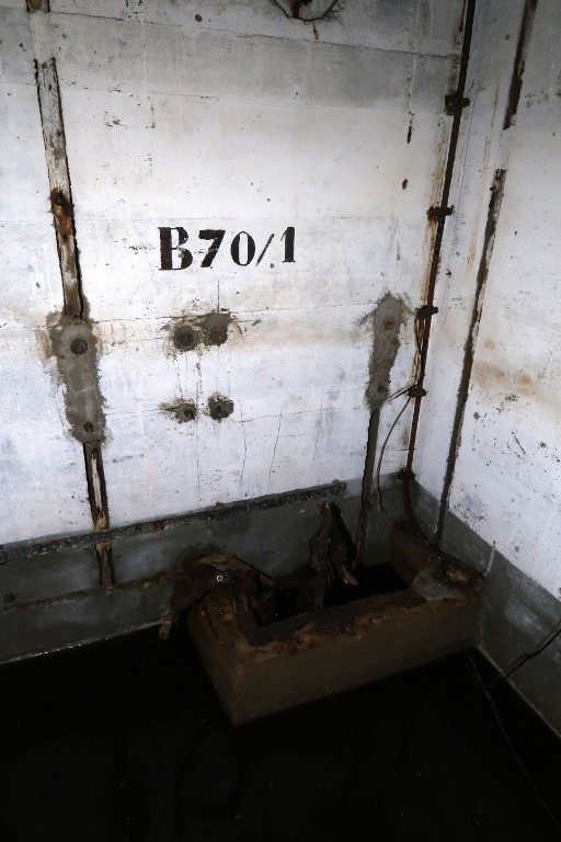 Vue intérieure : salle de garde nord, angle nord-est. Au sol, les arrivées des câbles téléphoniques du boîtier de connexion [disparu] qui était fixé au mur. Sur le mur nord se trouve peint le numéro du bunker : B 70 / 1Immatriculation
