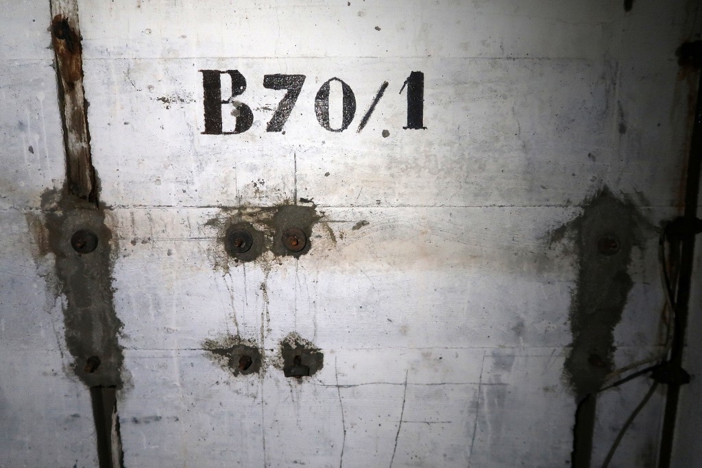 Vue intérieure : salle de garde nord, angle nord-est. Sur le mur nord se trouve peint le numéro du bunker : B 70 / 1Immatriculation