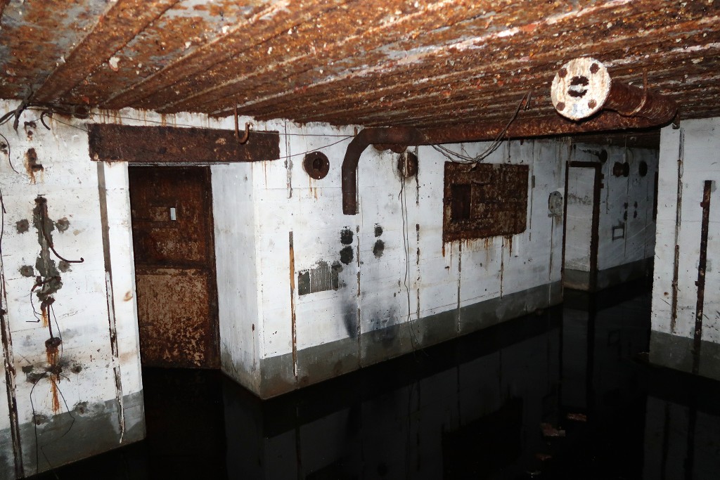 Vue intérieure : salle de garde nord depuis le nord-ouest. La porte donne accès à une petite pièce fermée par une porte blindée à deux vantauxImmatriculation