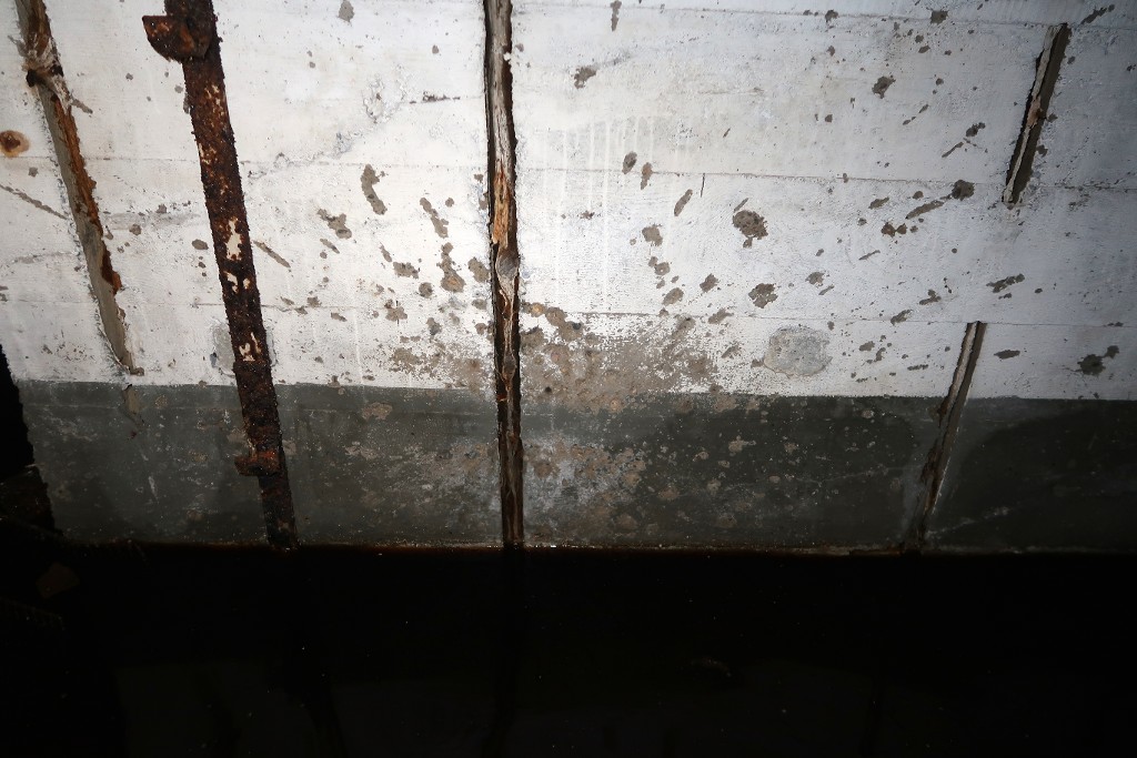 Vue intérieure : salle de garde nord, détail du mur de refend. Au niveau du sol, le mur montre les traces d'une explosionImmatriculation