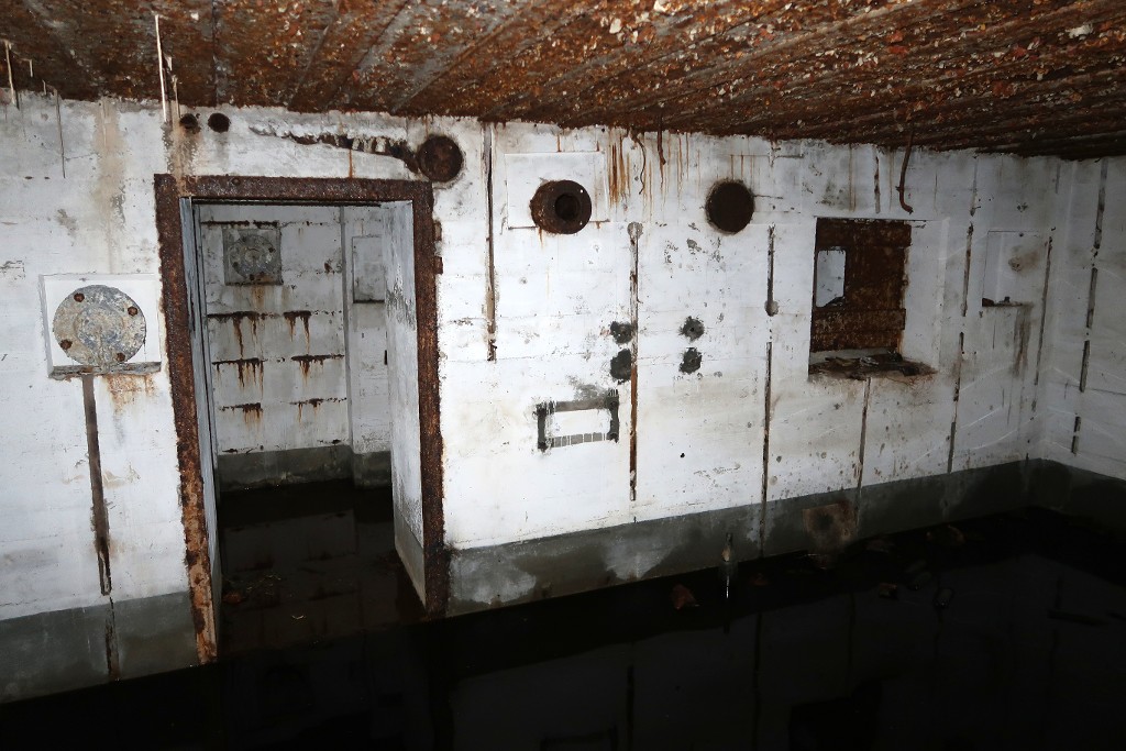 Vue intérieure : salle de garde sud. La porte débouche sur le sas. A gauche, bouche de surpression à clapet à contrepoids en aluminium ; au centre, emplacement du ventilateur [disparu] ; à droite, créneau blindé de défenseImmatriculation