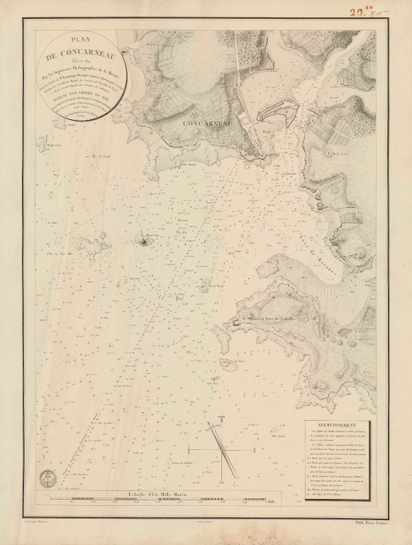 Plan de Concarneau : levé en 1819 sous les ordres de M. Beautemps-Beaupré (1766-1854) ; gravé par Chocarne. Editeur Dépôt général de la Marine, 1849.