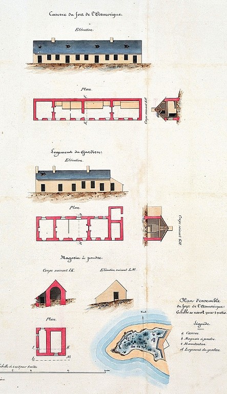 Atlas des bâtiments militaires, 1846 : feuille n° 16, caserne du fort de l'Armorique, logement du gardien et magasin à poudre (collection : Archives départementales du Finistère)Immatriculation