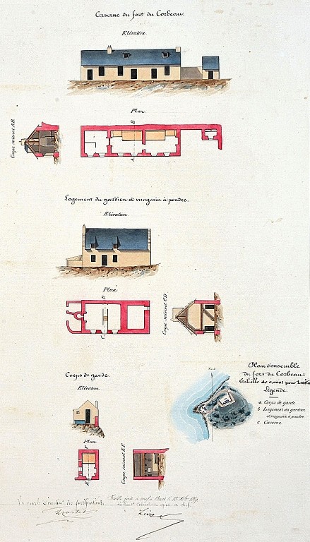 Atlas des bâtiments militaires, 1846 : feuille n° 16, caserne du fort du Corbeau, logement du gardien et magasin à poudre et corps de garde (collection : Archives départementales du Finistère)Immatriculation