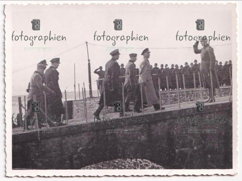 Photographie de la Marine-Flak 805 au fort du Corbeau à Plougastel, mars-avril 1941 : arrivée des officiers dont un amiral pour le passage en revue des soldats sur la plate-forme de la redoute (collection particulière)Immatriculation