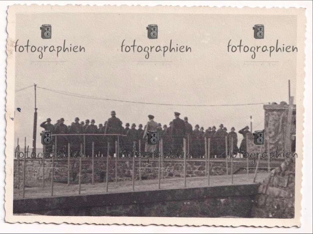 Photographie de la Marine-Flak 805 au fort du Corbeau à Plougastel, mars-avril 1941 : passage en revue des soldats sur la plate-forme de la redoute (collection particulière)Immatriculation
