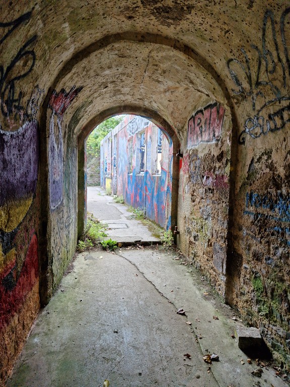 Vue du passage voûté de la poterne (état en 2024). Deux portes en fermaient l'accèsImmatriculation